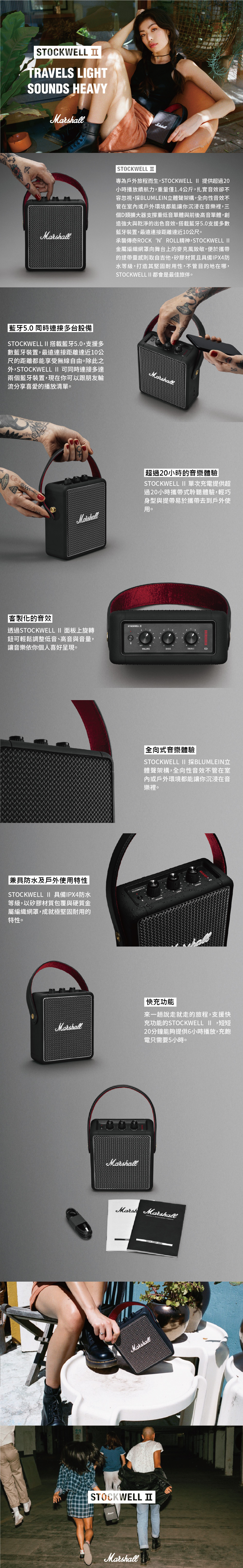 包裝內容物:MARSHALL Stockwell II可攜式立體聲喇叭、可拆提帶、USB-C電源線、快速入門指南、重要安全須知
